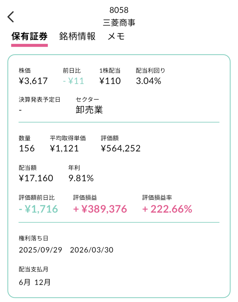 コロナショックの時から買い増しをしていた三菱商事は、現在156株年間配当額は17,160円となりました。